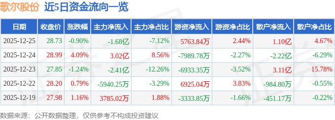 证券之星消息,截至2025年12月25日收盘,歌尔股份(002241)报收于28.73元,下跌0.9%,换手率2.62%,成交量82.25万手,成交额23.58亿元。