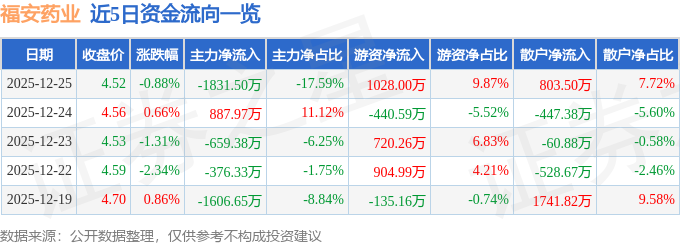 证券之星消息,截至2025年12月25日收盘,福安药业(300194)报收于4.52元,下跌0.88%,换手率2.38%,成交量23.02万手,成交额1.04亿元。