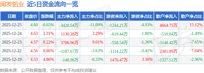 证券之星消息,截至2025年12月25日收盘,闽发铝业(002578)报收于4.6元,下跌0.65%,换手率7.86%,成交量67.7万手,成交额3.09亿元。