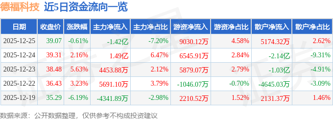 证券之星消息,截至2025年12月25日收盘,德福科技(301511)报收于39.07元,下跌0.61%,换手率13.33%,成交量49.91万手,成交额19.72亿元。