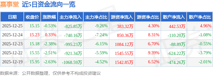 证券之星消息,截至2025年12月25日收盘,嘉事堂(002462)报收于15.15元,下跌0.53%,换手率2.03%,成交量5.9万手,成交额8918.01万元。