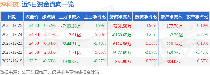 证券之星消息,截至2025年12月25日收盘,深科技(000021)报收于24.8元,下跌0.52%,换手率4.73%,成交量74.37万手,成交额18.55亿元。