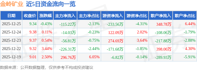 证券之星消息,截至2025年12月25日收盘,金岭矿业(000655)报收于9.34元,下跌0.43%,换手率0.98%,成交量5.82万手,成交额5414.68万元。