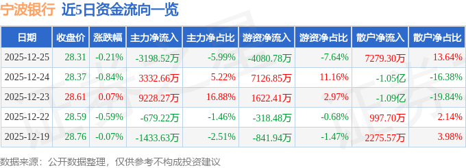 证券之星消息,截至2025年12月25日收盘,宁波银行(002142)报收于28.31元,下跌0.21%,换手率0.29%,成交量18.82万手,成交额5.34亿元。