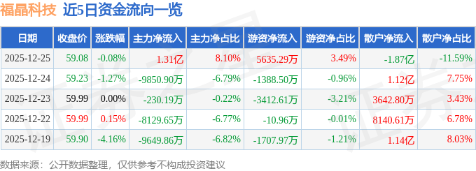 证券之星消息,截至2025年12月25日收盘,福晶科技(002222)报收于59.08元,下跌0.08%,换手率5.77%,成交量27.03万手,成交额16.15亿元。