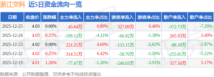 证券之星消息,截至2025年12月25日收盘,浙江交科(002061)报收于4.03元,上涨0.0%,换手率0.49%,成交量12.66万手,成交额5112.53万元。