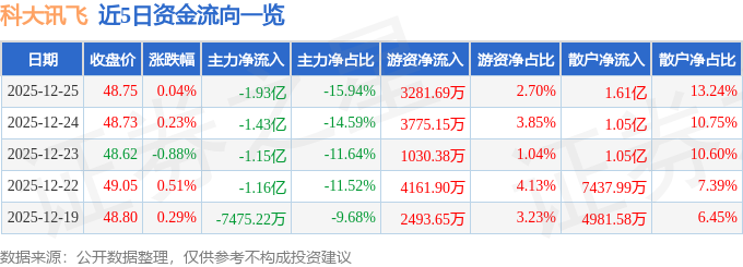 证券之星消息,截至2025年12月25日收盘,科大讯飞(002230)报收于48.75元,上涨0.04%,换手率1.14%,成交量24.95万手,成交额12.13亿元。