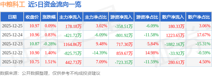 证券之星消息,截至2025年12月25日收盘,中粮科工(301058)报收于10.97元,上涨0.09%,换手率1.05%,成交量5.37万手,成交额5891.56万元。