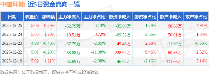 证券之星消息,截至2025年12月25日收盘,中建环能(300425)报收于5.06元,上涨0.2%,换手率0.58%,成交量3.97万手,成交额2008.35万元。
