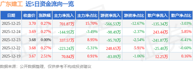 证券之星消息,截至2025年12月25日收盘,广东建工(002060)报收于3.7元,上涨0.27%,换手率0.77%,成交量12.06万手,成交额4471.84万元。