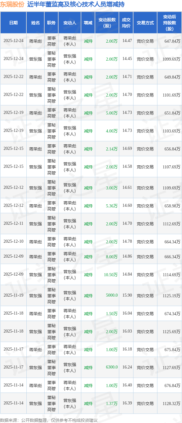 东瑞股份近半年内的董监高及核心技术人员增减持详情如下: