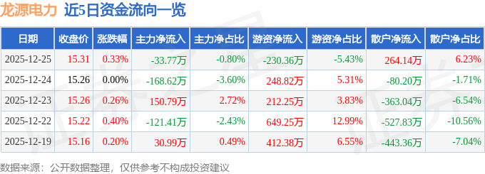 证券之星消息,截至2025年12月25日收盘,龙源电力(001289)报收于15.31元,上涨0.33%,换手率0.06%,成交量2.78万手,成交额4242.2万元。