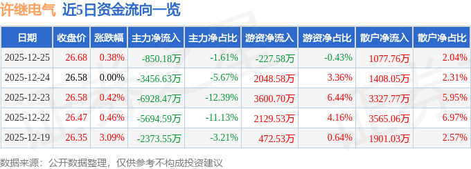 证券之星消息,截至2025年12月25日收盘,许继电气(000400)报收于26.68元,上涨0.38%,换手率1.96%,成交量19.87万手,成交额5.29亿元。
