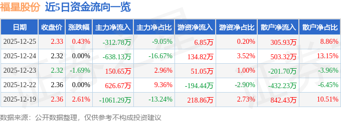 证券之星消息,截至2025年12月25日收盘,福星股份(000926)报收于2.33元,上涨0.43%,换手率0.94%,成交量14.87万手,成交额3454.66万元。