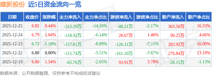 证券之星消息,截至2025年12月25日收盘,建新股份(300107)报收于6.82元,上涨0.44%,换手率0.94%,成交量3.26万手,成交额2226.25万元。