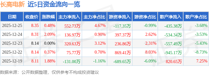 证券之星消息,截至2025年12月25日收盘,长高电新(002452)报收于8.35元,上涨0.48%,换手率2.76%,成交量14.22万手,成交额1.18亿元。