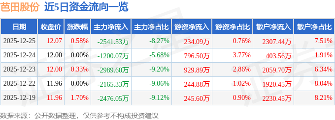 证券之星消息,截至2025年12月25日收盘,芭田股份(002170)报收于12.07元,上涨0.58%,换手率3.26%,成交量25.61万手,成交额3.07亿元。