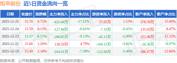 证券之星消息,截至2025年12月25日收盘,炬申股份(001202)报收于15.7元,上涨0.71%,换手率1.33%,成交量1.55万手,成交额2426.15万元。