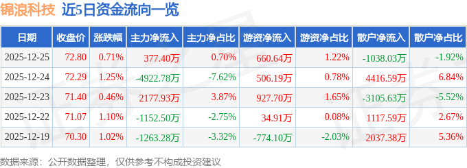 证券之星消息,截至2025年12月25日收盘,锦浪科技(300763)报收于72.8元,上涨0.71%,换手率2.32%,成交量7.46万手,成交额5.41亿元。
