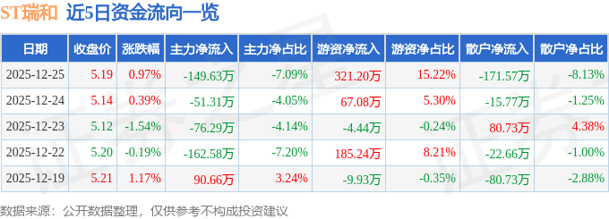 证券之星消息,截至2025年12月25日收盘,ST瑞和(002620)报收于5.19元,上涨0.97%,换手率1.3%,成交量4.09万手,成交额2110.67万元。