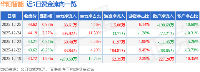 证券之星消息,截至2025年12月25日收盘,华阳智能(301502)报收于44.62元,上涨0.97%,换手率1.79%,成交量4219.0手,成交额1874.14万元。