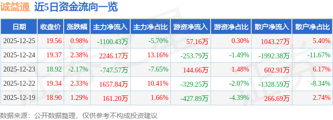 证券之星消息,截至2025年12月25日收盘,诚益通(300430)报收于19.56元,上涨0.98%,换手率3.8%,成交量9.89万手,成交额1.93亿元。