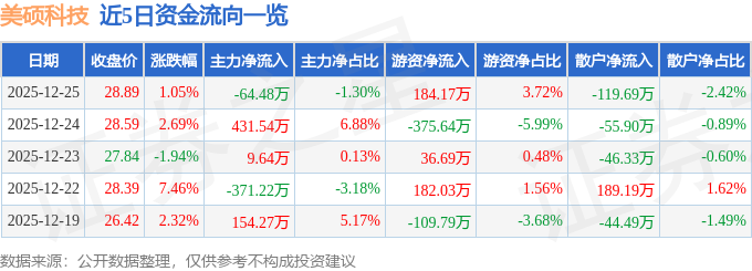 证券之星消息,截至2025年12月25日收盘,美硕科技(301295)报收于28.89元,上涨1.05%,换手率5.87%,成交量1.73万手,成交额4955.52万元。