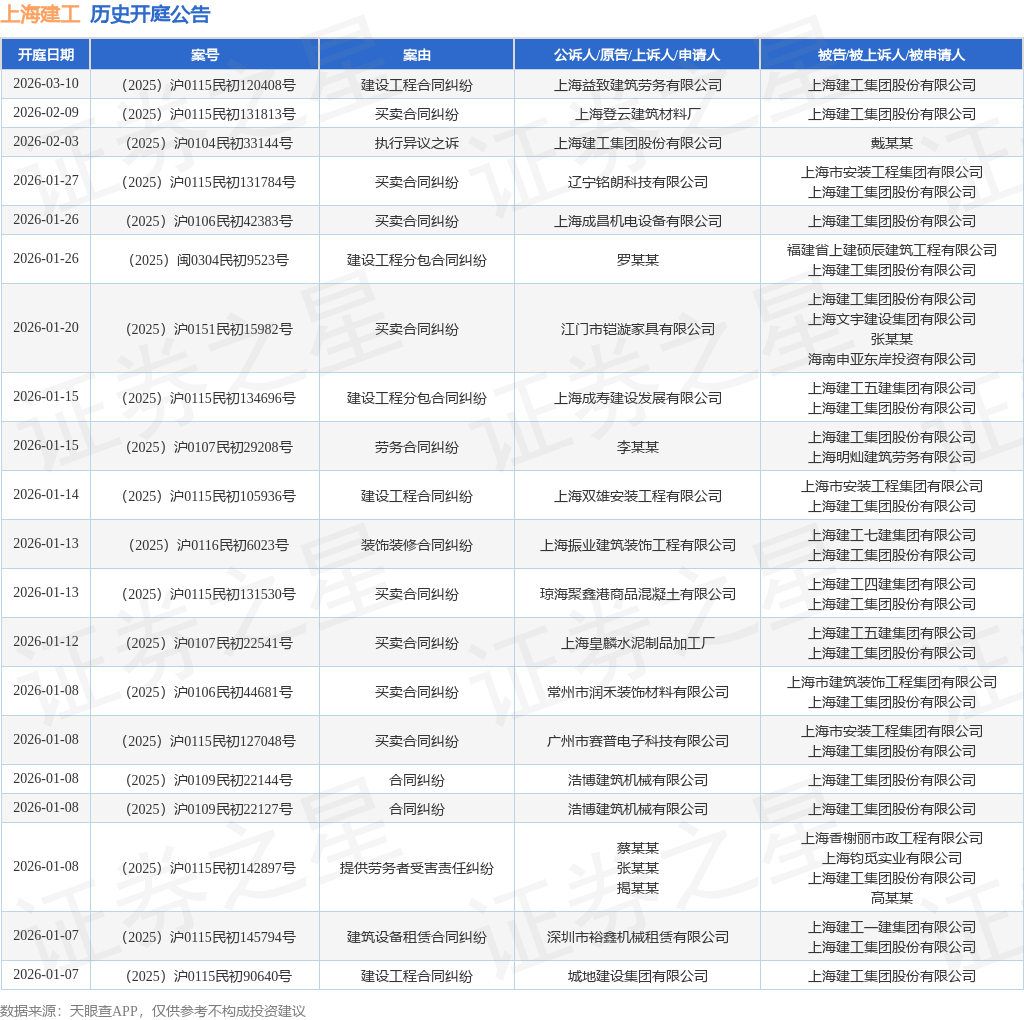 案号:(2025)沪01民初212号根据统计,近一年内以上海建工集团股份有限公司为当事人的历史开庭公告有453则,其中案由为“买卖合同纠纷”的公告以120则居首,其次为“建设工程施工合同纠纷”有85则,“建设工程分包合同纠纷”有42则。历史开庭公告(前20条)如下: