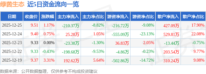 证券之星消息,截至2025年12月25日收盘,绿茵生态(002887)报收于9.51元,上涨1.17%,换手率1.3%,成交量2.52万手,成交额2385.64万元。