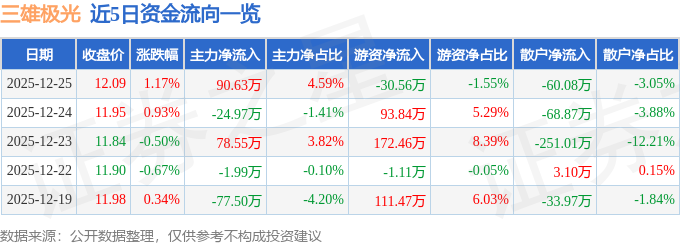 证券之星消息,截至2025年12月25日收盘,三雄极光(300625)报收于12.09元,上涨1.17%,换手率1.01%,成交量1.64万手,成交额1972.61万元。