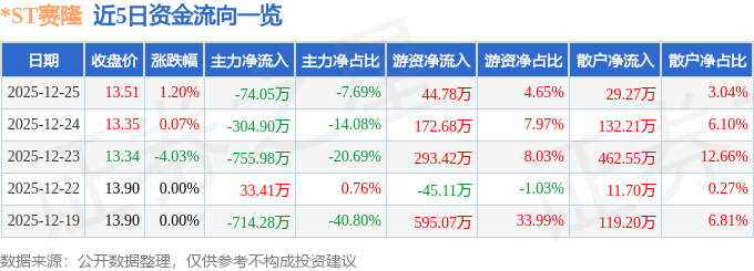 证券之星消息,截至2025年12月25日收盘,*ST赛隆(002898)报收于13.51元,上涨1.2%,换手率0.71%,成交量7167.0手,成交额962.49万元。