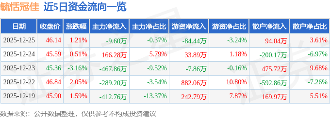 12月25日的资金流向数据方面,主力资金净流出9.6万元,占总成交额0.37%,游资资金净流出84.44万元,占总成交额3.24%,散户资金净流入94.04万元,占总成交额3.61%。