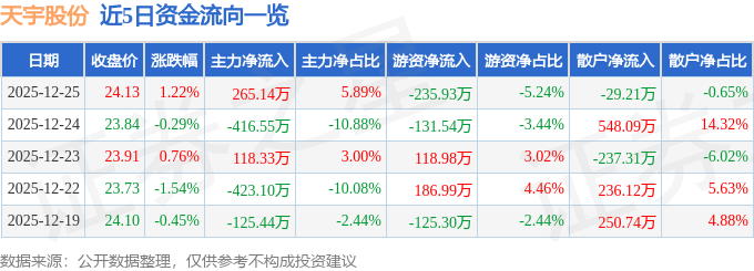 12月25日的资金流向数据方面,主力资金净流入265.14万元,占总成交额5.89%,游资资金净流出235.93万元,占总成交额5.24%,散户资金净流出29.21万元,占总成交额0.65%。