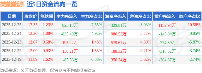 证券之星消息,截至2025年12月25日收盘,美能能源(001299)报收于12.35元,上涨1.23%,换手率4.03%,成交量8.81万手,成交额1.09亿元。