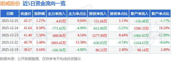 证券之星消息,截至2025年12月25日收盘,朗威股份(301202)报收于42.17元,上涨1.27%,换手率8.49%,成交量3.16万手,成交额1.34亿元。