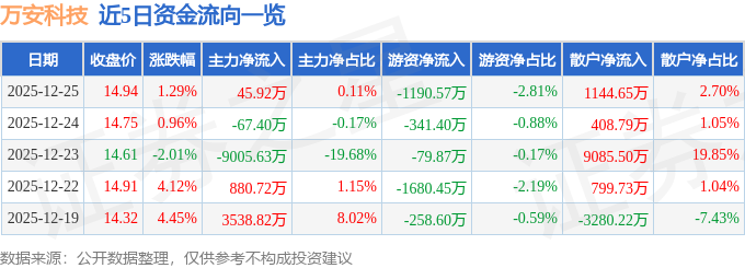 证券之星消息,截至2025年12月25日收盘,万安科技(002590)报收于14.94元,上涨1.29%,换手率5.71%,成交量28.26万手,成交额4.24亿元。