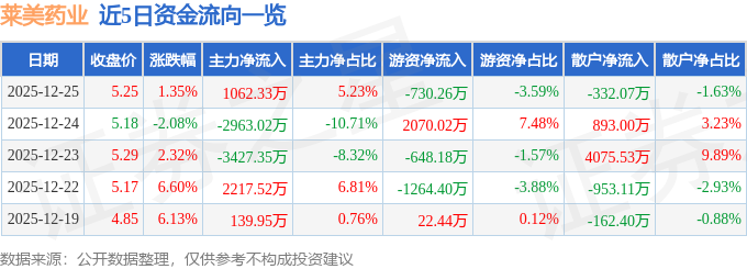 证券之星消息,截至2025年12月25日收盘,莱美药业(300006)报收于5.25元,上涨1.35%,换手率3.65%,成交量38.54万手,成交额2.03亿元。