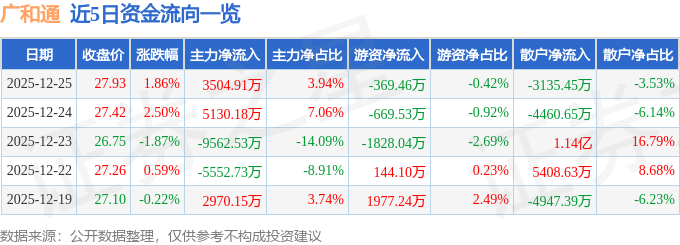 证券之星消息,截至2025年12月25日收盘,广和通(300638)报收于27.93元,上涨1.86%,换手率6.02%,成交量32.06万手,成交额8.89亿元。