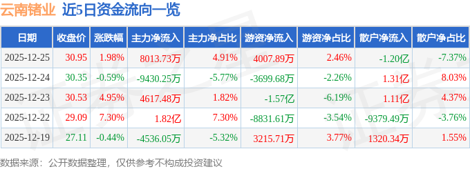 证券之星消息,截至2025年12月25日收盘,云南锗业(002428)报收于30.95元,上涨1.98%,换手率8.11%,成交量52.93万手,成交额16.32亿元。