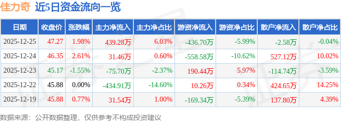 证券之星消息,截至2025年12月25日收盘,佳力奇(301586)报收于47.27元,上涨1.98%,换手率2.92%,成交量1.54万手,成交额7287.35万元。