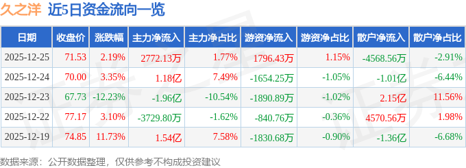 证券之星消息,截至2025年12月25日收盘,久之洋(300516)报收于71.53元,上涨2.19%,换手率12.35%,成交量22.23万手,成交额15.67亿元。