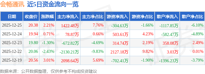 证券之星消息,截至2025年12月25日收盘,会畅通讯(300578)报收于20.38元,上涨2.21%,换手率4.57%,成交量9.05万手,成交额1.83亿元。