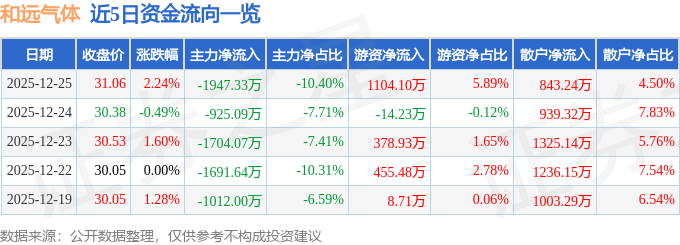 证券之星消息,截至2025年12月25日收盘,和远气体(002971)报收于31.06元,上涨2.24%,换手率3.8%,成交量6.11万手,成交额1.87亿元。