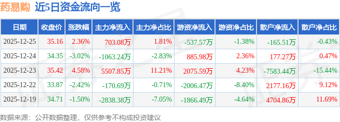 证券之星消息,截至2025年12月25日收盘,药易购(300937)报收于35.16元,上涨2.36%,换手率17.53%,成交量11.03万手,成交额3.89亿元。