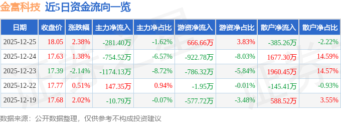 证券之星消息,截至2025年12月25日收盘,金富科技(003018)报收于18.05元,上涨2.38%,换手率9.89%,成交量9.69万手,成交额1.74亿元。