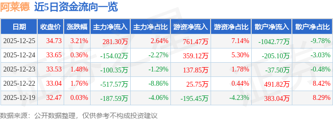 证券之星消息,截至2025年12月25日收盘,阿莱德(301419)报收于34.73元,上涨3.21%,换手率7.35%,成交量3.12万手,成交额1.07亿元。