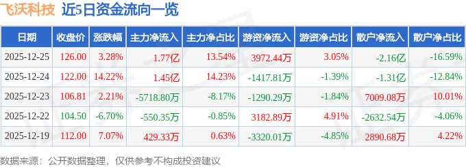 证券之星消息,截至2025年12月25日收盘,飞沃科技(301232)报收于126.0元,上涨3.28%,换手率23.35%,成交量10.43万手,成交额13.04亿元。