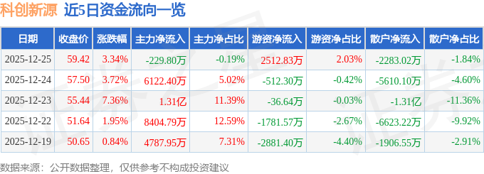 证券之星消息,截至2025年12月25日收盘,科创新源(300731)报收于59.42元,上涨3.34%,换手率17.5%,成交量21.03万手,成交额12.39亿元。
