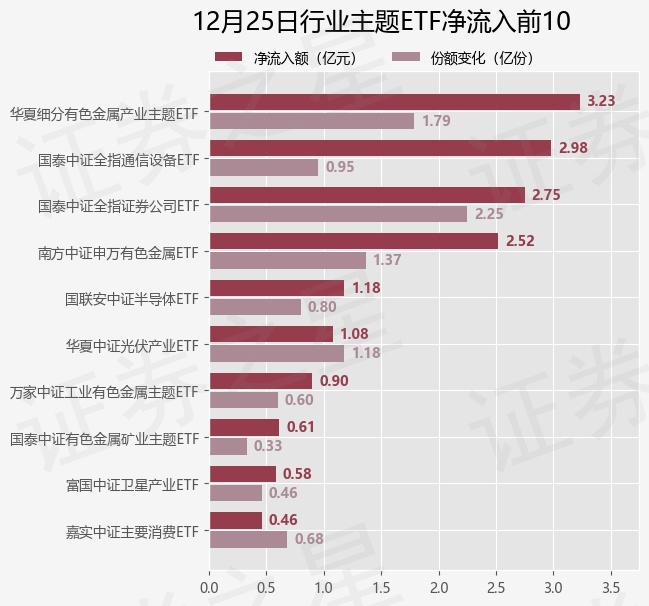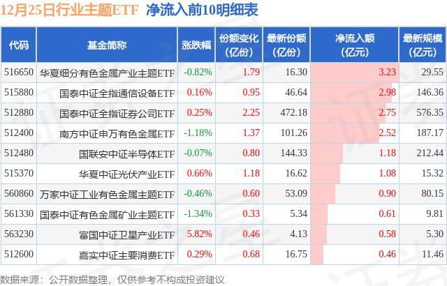 当日有55只行业主题ETF基金出现资金净流入,其中净流入排首位的是华夏细分有色金属产业主题ETF(516650),份额增加了1.79亿份,净流入额为3.23亿元。