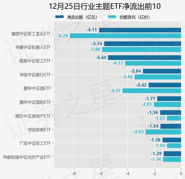 证券之星消息,12月25日行业主题ETF基金合计资金净流出25.65亿元,近5个交易日累计净流出121.84亿元,5个交易日中出现日合计资金净流出的有4天(ETF资金流向计算公式:(当日ETF场内流通份额-前一交易日ETF场内流通份额)*当日ETF均价,计算结果仅供参考)。